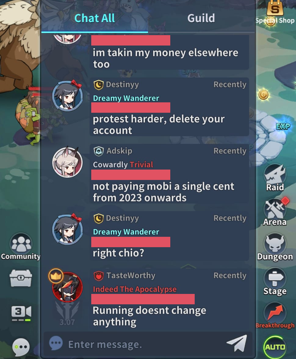 Another game I find noteworthy here is Blade Idle. At the heart of it is an incredibly simple toy: you character idly slashes at endlessly respawning enemies in a tiny arena. This toy never really changes, instead the game throws a seemingly endless number of journeys at you and promises you ever more of them. But pay attention to the global chat: players regularly talk about how Blade Idle is like a tiny cozy home to them. Names are recognized and greetings are regularly exchanged. Topics mirror what you’d talk about with friends: how they’ve been doing, life advice, support, and so on. They’ll even poke fun at the game being not that fun – quite harshly too – but they always come back to continue socializing.