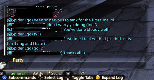 Final Fantasy 14: Players encouraging a novice tank and reassuring them that everything will be fine.